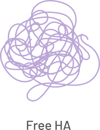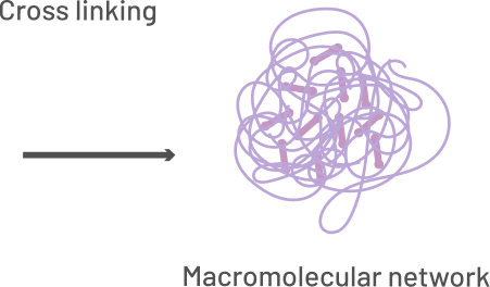 Initially, free hyaluronic acid is shown as a tangled network of individual polymer chains.